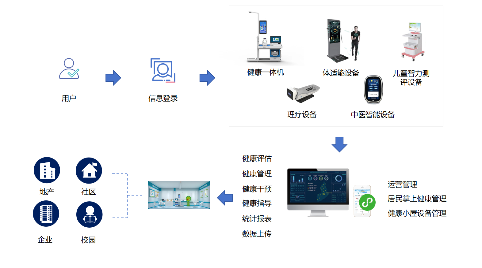 通過設(shè)備采集居民健康數(shù)據(jù),并上傳系統(tǒng),納入居民健康賬戶,促進(jìn)健康檢測(cè)數(shù)據(jù)在各類機(jī)構(gòu)間的利用,提升服務(wù)效率