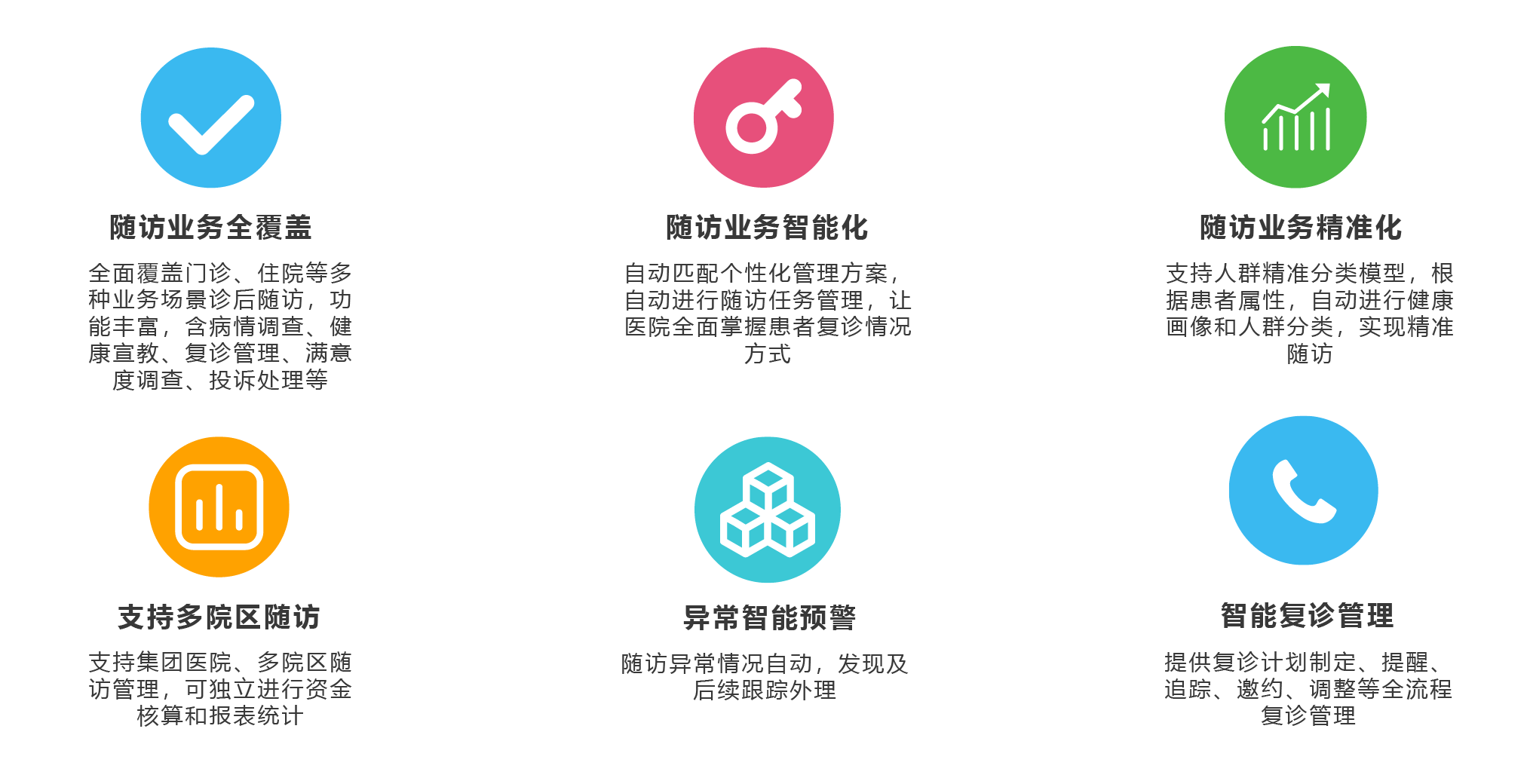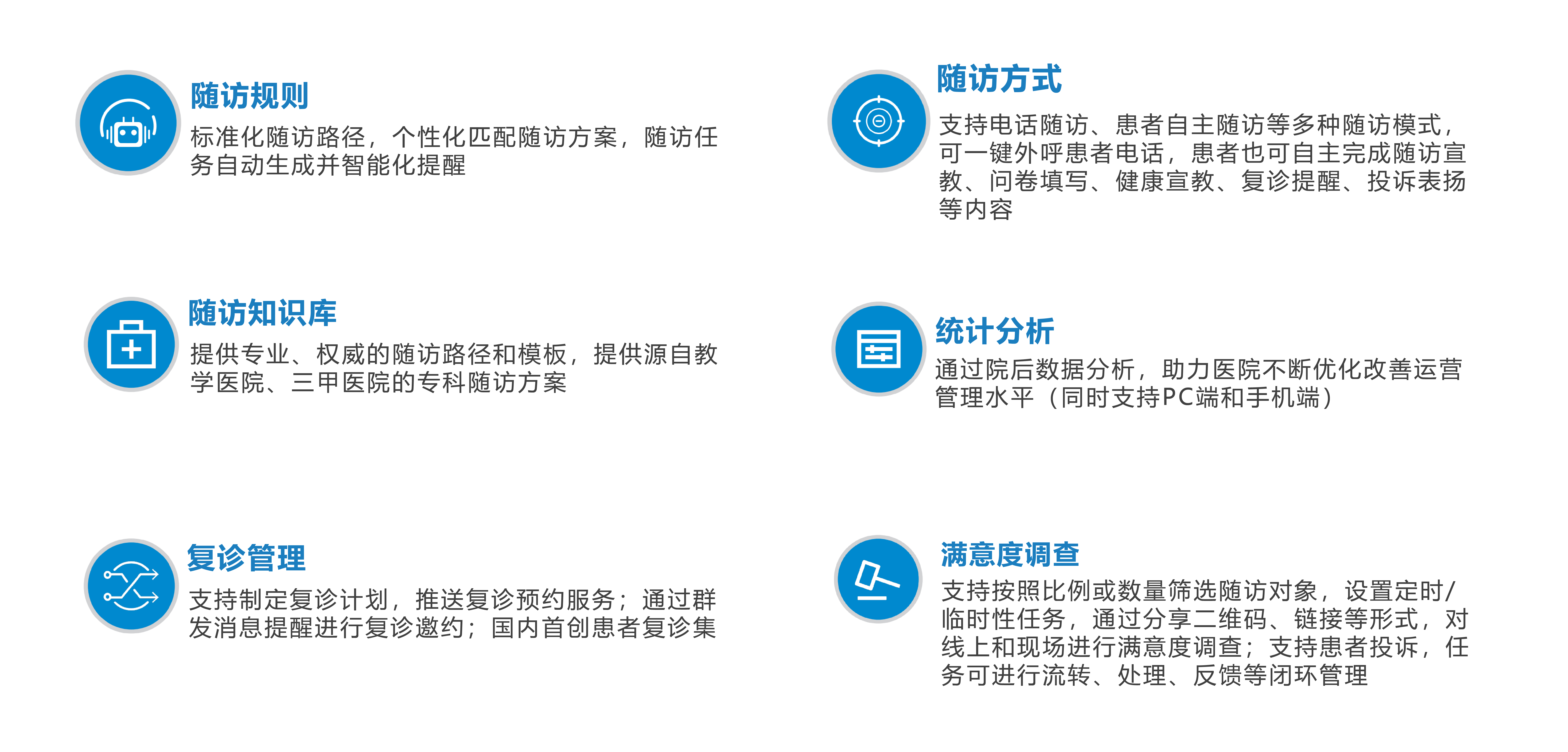 智能隨訪系統(tǒng)是運用互聯(lián)網(wǎng)、物聯(lián)網(wǎng)和人工智能等技術,將患者院內(nèi)外醫(yī)療服務與健康管理相結合,以診后隨訪、智能宣教、復診提醒、健康監(jiān)測、醫(yī)護患溝通等為患者管理主要手段,為不同類型醫(yī)療機構打造一站式的隨訪方案,為醫(yī)院提供院級隨訪、門診患者隨訪、住院患者隨訪、重點專案隨訪等符合不同應用場景的隨訪方案。